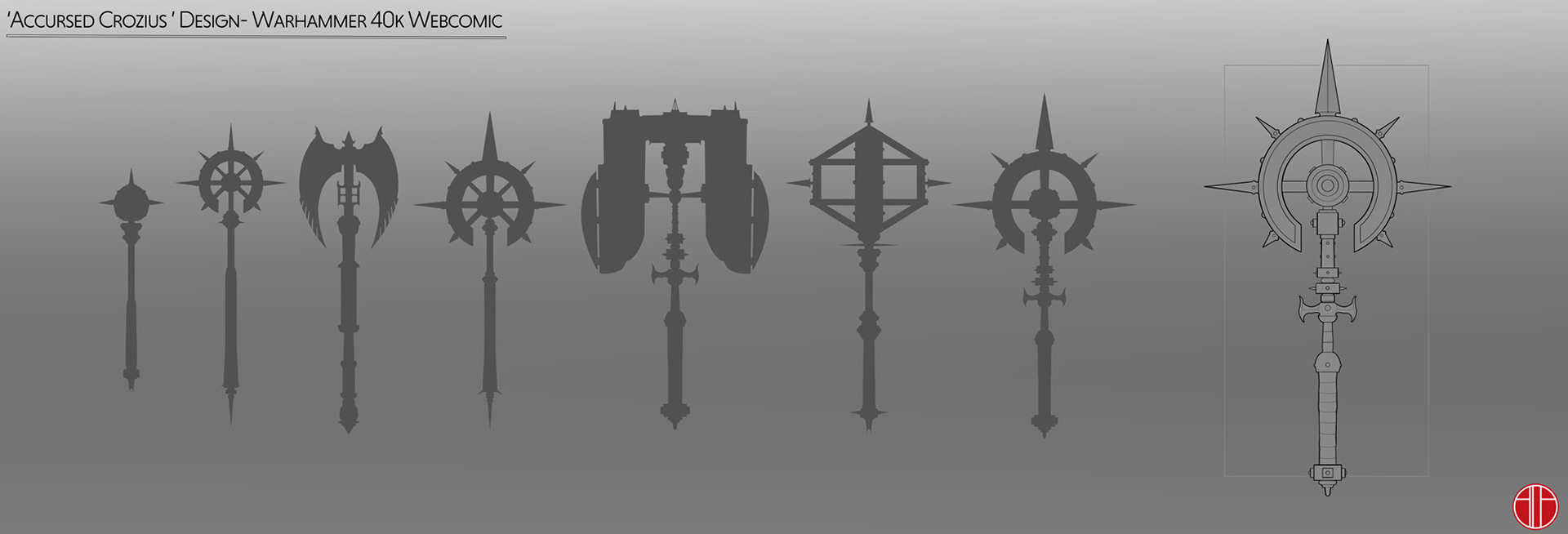 A set of silhouettes and the chosen concept prop design for the protagonists weapon in the cancelled Games Workshop web comic project, also written by myself.